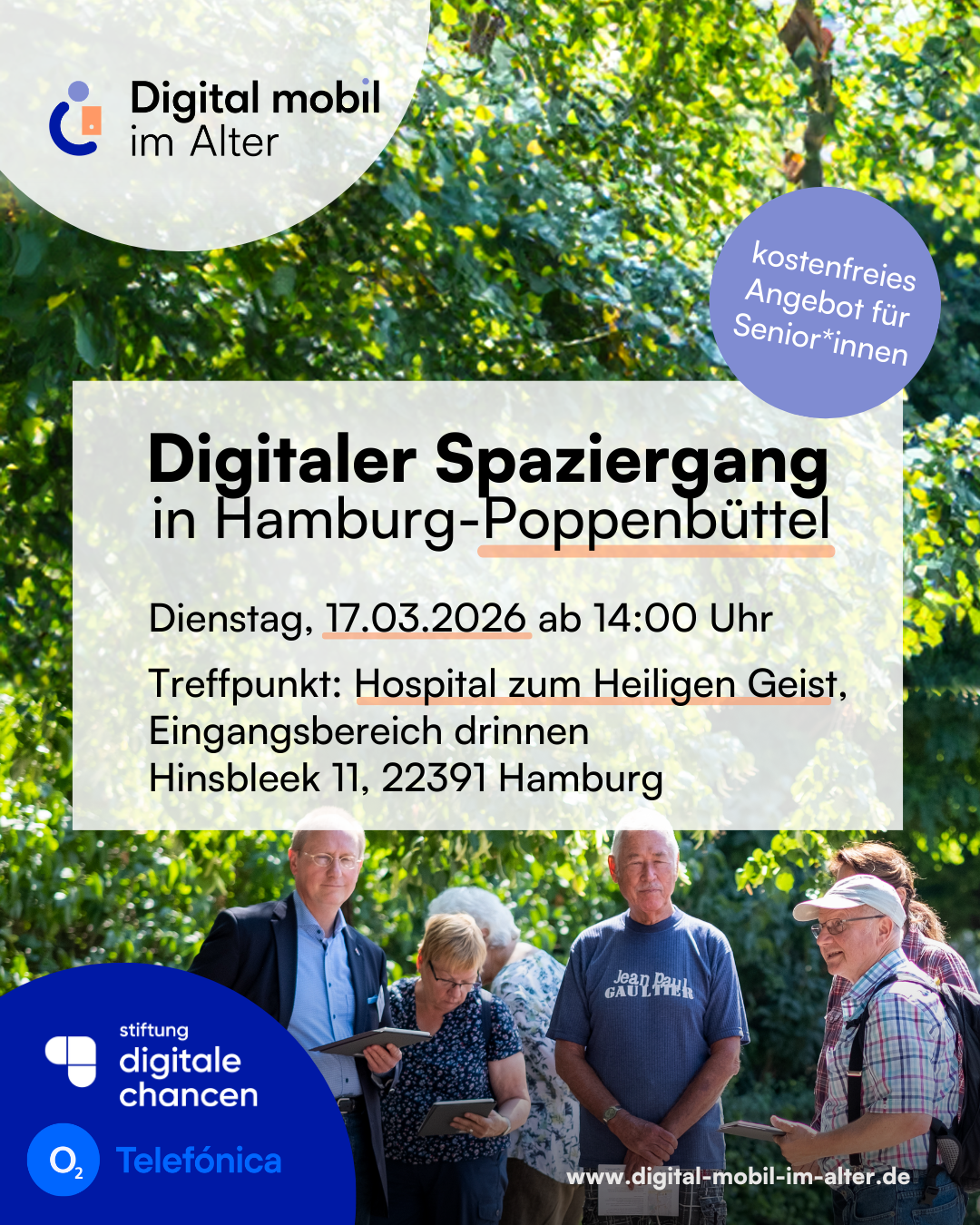 Im Rahmen von Digital mobil im Alter, der gemeinsamen Initiative von O₂ Telefónica und der Stiftung Digitale Chancen, möchten wir die Nutzungsmöglichkeiten digitaler Geräte für Senior*innen praktisch und spielerisch erfahrbar machen. Dafür haben wir das Format der Digitalen Spaziergänge entwickelt. Gemeinsam erkunden wir auf innovative und unterhaltsame Weise die Umgebung auf dem Gelände des Hospital zum Heiligen Geist in Hamburg.