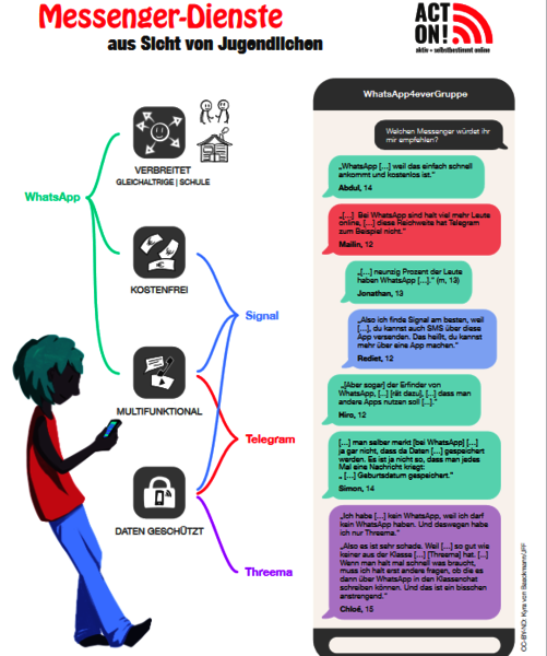 Ein Großteil der Befragten gab an, dass Messenger-Dienste vor allem weit verbreitet, kostenlos, datensicher und multifunktional sein sollen. Für viele Jugendliche nimmt der Messenger-Dienst WhatsApp einen hohen Stellenwert ein, da die App von vielen im Freundes- und Bekanntenkreis und auch häufig im Schulkontext genutzt wird. Zudem sehen viele einen Vorteil darin, dass die App kostenlos ist und verschiedene Funktionen wie Chat- und Sprachrichten sowie Sprach- und Videoanrufe anbietet.