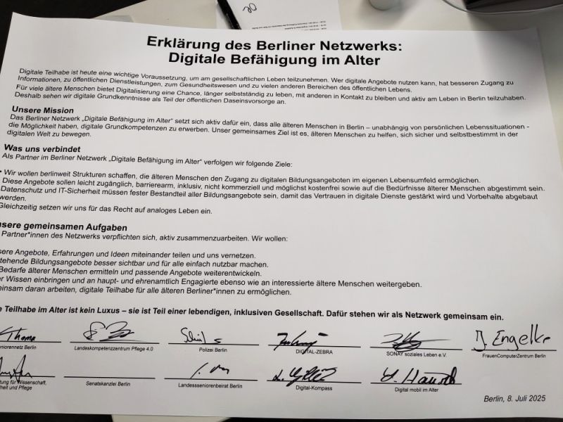 Wir freuen uns sehr auf die Zusammenarbeit, den Austausch und die nächsten Schritte im Netzwerk - gemeinsam mit dem Seniorennetz Berlin, dem FrauenComputerZentrum Berlin e.V., den Digital-Zebras, Sonay soziales Leben e.V., dem Berliner Landeskompetenzzentrum Pflege 4.0, Deutschland sicher im Netz, der Polizei Berlin und vielen weiteren engagierten Akteuren!