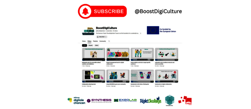 Mithilfe von 30 Microlearning-Videos wird Kulturmitarbeitenden ein niedrigschwelliger Zugang zu digitalen Skills in drei Wissensbereichen, die im Kulturbereich besonders wichtig sind, ermöglicht. Die Videos sind neben der E-Learning-Plattform über YouTube @Boostdigiculture abrufbar.
