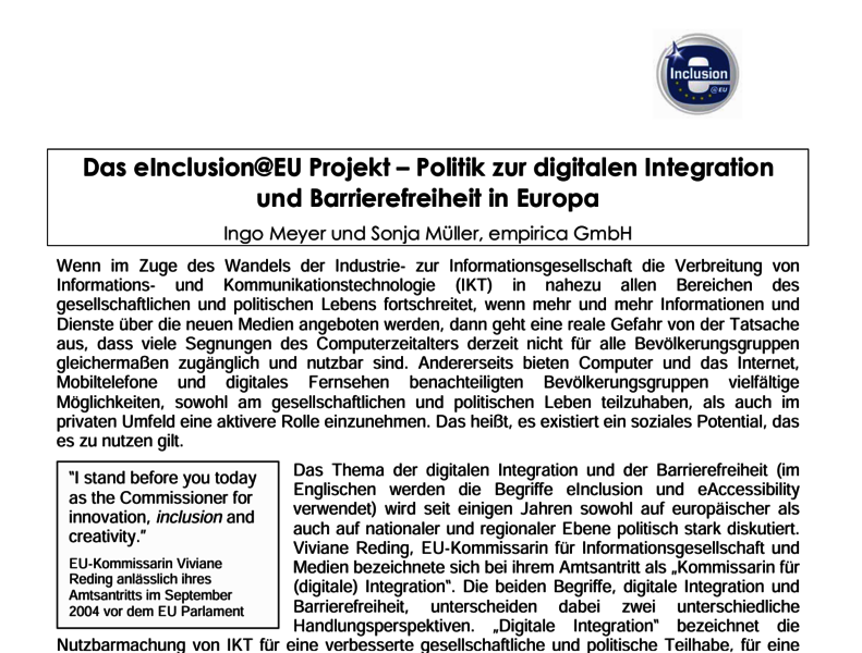 Das von der EU geförderte Projekt eInclusion@EU hat sich zur Aufgabe gemacht, den politischen Diskussionsprozess zu digitaler Integration und Barrierefreiheit auf der europäischen Ebene zu begleiten und zu beleben. Ziel ist es, möglichst viele Akteure des Themenfelds an einen Tisch zu bringen und mit ihnen gemeinsam politische Ansätze zu ausgewählten Themen zu diskutieren und voranzubringen und daraus Empfehlungen für politische Maßnahmen abzuleiten. Der vorliegende Bericht gibt einen kurzen überblick über Ziele, Schlüsselthemen und erste Ergebnisse des eInclusion@EU Projekts.