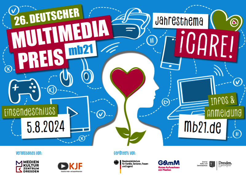 Der Startschuss für die 26. Runde ist gefallen! Auch dieses Jahr können junge Medienmacher*innen bis 25 Jahre am bundesweiten Wettbewerb Deutscher Multimediapreis mb21 teilnehmen! Das diesjährige Jahresthema „iCare“ rückt die mentale und physische Gesundheit junger Menschen in den Fokus. Der Wettbewerb ist bundesweit einzigartig und zeichnet digitale, netzbasierte und interaktive Arbeiten und Projekte von Kindern, Jugendlichen und jungen Erwachsenen aus. Dabei ist eine weite Brandbreite von Formaten möglich, von Blogs, Apps und Games bis zu Making-Projekten und medienkünstlerischen Installationen.