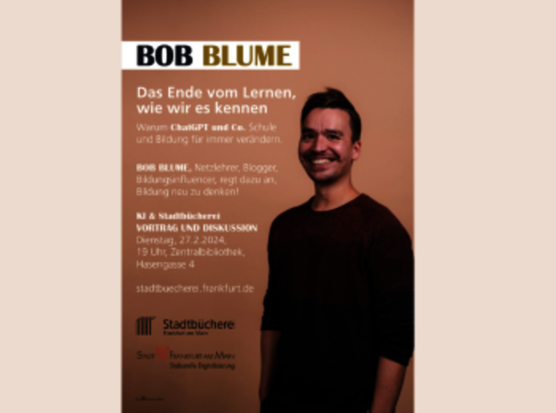 Diesen Fragen geht der Lehrer, Autor und Blogger Bob Blume in einem Vortrag „Das Ende vom Lernen, wie wir es kennen – Warum ChatGPT und Co. Schule und Bildung für immer verändern“ am 27. Februar 2024 in der Zentralbibliothek in Frankfurt am Main nach. Interessierte sind herzlich eingeladen. Mehr Informationen zur Veranstaltung gibt es auf der Webseite der Frankfurter Zentralbibliothek.