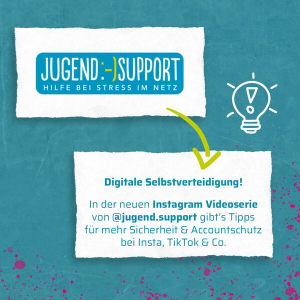 Auf 22 Hilfeseiten finden Jugendliche Tipps und Informationen zur Digitalen Selbstverteidigung. Auch auf dem Instagram-Kanal von jugend.support können sich junge Menschen in der Videoserie „Digitale Selbstverteidigung“ zu stressigen Situationen im Netz informieren und erhalten dort entsprechende Tipps zu Themen wie Datenschutz oder Accounteinstellungen.