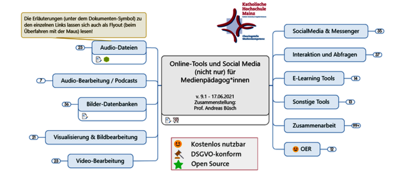 Die MindMap der Clearingstelle Medienkompetenz verschafft einen schnellen Überblick über die Landschaft der Online-Tools und Social Media Plattformen. Die Tools und Plattformen sind mit den Symbolen „kostenlos“, „DSGVO-konfrom“ und „Open Source“ gekennzeichnet, sodass nach diesen Kriterien ein Tool ausgewählt werden kann. „Kostenlos“ bedeutet, dass das jeweilige Tools ohne Einschränkungen, wie beispielsweise einer Teilnehmendenanzahl oder einer zeitlichen Beschränkung, kostenfrei genutzt werden kann. „DSGVO-konform“ bedeutet, dass das jeweilige Tool nach Einschätzung der Clearingstelle Medienkompetenz datenschutzkonform nutzbar ist. Kriterien dafür sind unter anderem der Standort des Servers in der EU oder einem sicheren Drittland, sowie eine umfassende Erklärung zum Datenschutz und zur Datenverarbeitung. Bei Tools mit Open Source (engl.= „offene Quelle“) sind die Quellcodes öffentlich einsehbar.