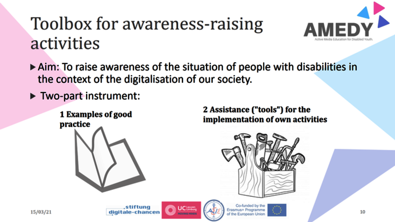 Ziel des Fachaustausches war es auch, einen ersten Blick in die Toolbox für bewusstseinsfördernde Aktivitäten zu gewährleisten, die im Rahmen des Erasmus+ Projekts "AMEDY" entwickelt wurde. Das zweiteilige Instrument enthält zum einen eine Sammlung von Best Practices, also bewährte Aktivitäten, Kampagnen und Aktionen, die in den drei Partnerländern Deutschland, Griechenland und Belgien, aber auch im internationalen Kontext in der Vergangenheit erfolgreich auf die (digitalen) Bedürfnisse von Menschen mit Behinderungen aufmerksam gemacht haben. Diese Beispiele guter Praxis sollen Organisationen, Verbände und Einrichtungen dazu anregen und inspirieren, eigene Aktivitäten zur Bewusstseinsförderung umzusetzen. Um sie bei der Umsetzung solcher Aktivitäten zu unterstützen, enthält die Toolbox darüber hinaus eine Zusammenstellung von konkreten Hilfestellungen, praktischen Anleitungen, Werkzeugen, nützlichen Ressourcen und innovativen Methoden, mit deren Hilfe Aktivitäten in verschiedenen Dimensionen umgesetzt werden können (Kampagnen im digitalen Raum, Workshops, Großveranstaltungen), die unterschiedliche Zielgruppen ansprechen (Jugendliche, Fachkräfte, Öffentlichkeit).