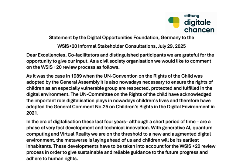 Erklärung der Stiftung Digitaler Chancen zu den informellen Konsultationen der Interessengruppen im Rahmen des WSIS+20, 29. Juli 2025