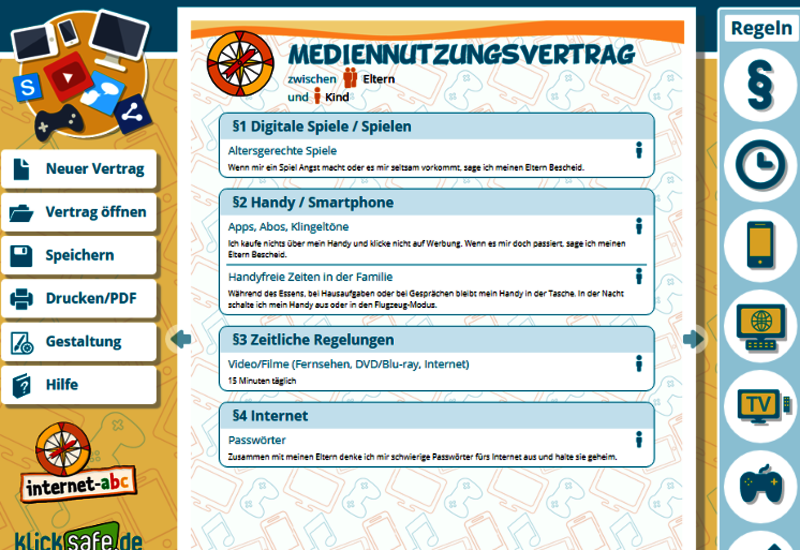 Internet-ABC und klicksafe.de haben eine Plattform geschaffen, auf der Eltern gemeinsam mit ihren Kindern (jeweils für die Altersgruppen 6-12 und über 12 Jahre) online einen Mediennutzungsvertrag erstellen können. Es gibt die Möglichkeit Regeln zu unterschiedlichen Medien, wie Smartphone oder Fernsehen zu erstellen, sowie Nutzungszeiten und allgemeine Verhaltensregeln im Medienumgang festzulegen. Für die Regeln können Vorlagen oder freie Formulierungen genutzt werden. Der Vertrag ist für den Ausdruck geeignet und über einen Zahlencode für spätere Anpassungen abrufbar.