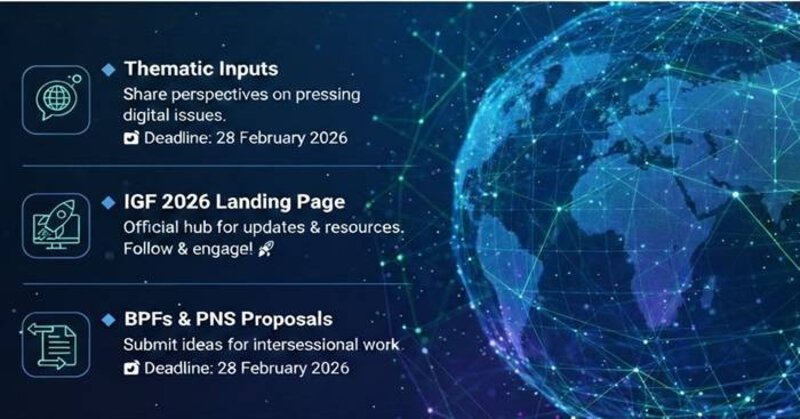 Bis zum 28. Februar 2026 23:59 (UTC) besteht die Möglichkeit, thematische Beiträge einzureichen, die beim Internet Governance Forum (IGF) 2026 schwerpunktmäßig Berücksichtigung finden sollen. Über dieses Formular können Organisationen und Einzelpersonen Themen auswählen, die ihrer Meinung nach von aktueller Relevanz zur Regulierung des Internets sind. In einem weiteren Eingabefeld können weitere Informationen hinzugefügt werden, um die Auswahl zu präzisieren. Alle Einreichungen werden auf der Seite des IGF veröffentlicht werden. Nach Ablauf der Frist wird eine Auswertung zur Findung des diesjährigen Themas stattfinden.
