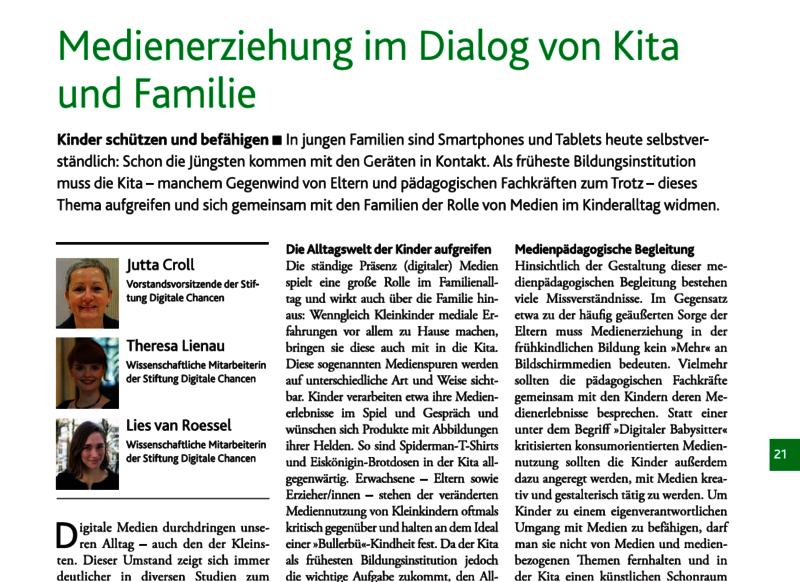 In jungen Familien sind Smartphones und Tablets heute selbstverständlich: Schon die Jüngsten kommen mit den Geräten in Kontakt. Als früheste Bildungsinstitution muss die Kita dieses Thema aufgreifen und sich gemeinsam mit den Familien der Rolle von Medien im Kinderalltag widmen.