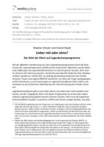 In einer Studie hat das Hans-Bredow-Institut ermittelt welche Kenntnisse Eltern zu Jugendschutzprogrammen haben. Weiterhin wurde untersucht, welche Erwartungen Eltern an die Programme haben und inwieweit sie die technischen Hilfsmittel einsetzen. Die Ergebnisse der Studie werden in dem vorliegenden Bericht "Lieber mit oder ohne?" zusammengefasst.
