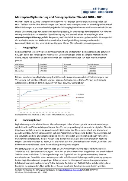 Die Stiftung Digitale Chancen hat auf der Basis eigener Studien und Projekterfahrungen unter Hinzuziehung statistischer Erhebungen zur Nutzung digitaler Medien in der Bevölkerung einen Masterplan Digitalisierung und Demographischer Wandel für die kommenden vier Jahre erarbeitet. Das Dokument zeigt den politischen Handlungsbedarf für die Belange der Generation 70+ vor dem Hintergrund der fortschreitenden Digitalisierung auf und entwirft ein Programm an konkreten Maßnahmen für eine responsive Digitalisierungspolitik. Responsiv, weil die Politik Antworten geben muss, die der Heterogenität der sozio-ökonomischen Verhältnisse sowie dem jeweiligen Bildungshintergrund und den Lernmöglichkeiten in den verschiedenen Gruppen älterer Menschen Rechnung tragen, damit die versprochene Teilhabe gelingt.
