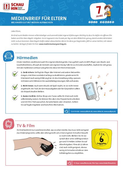 Ihr Kind nutzt Medien immer selbstständiger und sammelt dabei eigene Erfahrungen. Wichtig ist, dass Sie dafür ein offenes Ohr haben und ihm klare Regeln mitgeben. So ist insgesamt eine Stunde pro Tag vor dem Bildschirm genug, damit andere Aktivitäten nicht zu kurz kommen. Klare Regeln zur Internetnutzung oder Fernsehnutzung helfen dabei abzuschalten.