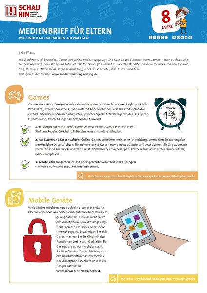 Mit 8 Jahren sind besonders Games bei vielen Kindern angesagt. Die Konsole wird immer interessanter - aber auch andere Medien wie Fernseher, Handy und Internet. Die Medienvielfalt nimmt zu. Wichtig: Behalten Sie den Überblick und vereinbaren Sie feste Regeln für die Nutzung.