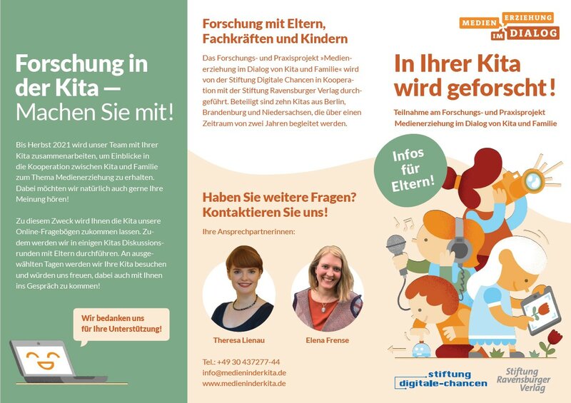 Das Forschungs- und Praxisprojekt "Medienerziehung im Dialog von Kita und Familie" wird von der Stiftung Digitale Chancen in Kooperation mit der Stiftung Ravensburger Verlag durch geführt. Beteiligt sind zehn Kitas aus Berlin, Brandenburg und Niedersachsen, die über einen Zeitraum von zwei Jahren begleitet werden.