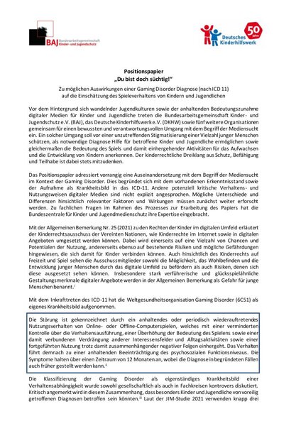 Das Deutsche Kinderhilfswerk und die Bundesarbeitsgemeinschaft Kinder- und Jugendschutz fordern vor dem Hintergrund sich wandelnder Jugendkulturen sowie der anhaltenden Bedeutungszunahme digitaler Medien für Kinder und Jugendliche einen bewussten und verantwortungsvollen Umgang mit dem Begriff der Mediensucht. Ein solcher Umgang sollte vor einer unzutreffenden Stigmatisierung einer Vielzahl junger Menschen schützen, als notwendige Diagnose Hilfe für betroffene Kinder und Jugendliche ermöglichen sowie gleichermaßen die Bedeutung des Spiels und damit einhergehender Aktivitäten für das Aufwachsen und die Entwicklung von Kindern anerkennen.