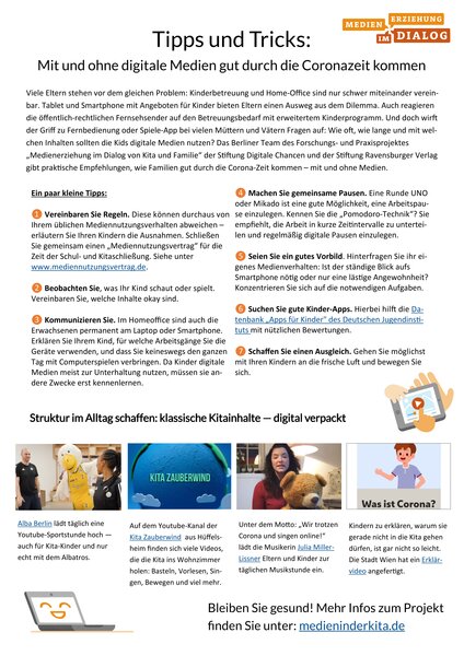 Infosheet für Kitas mit hilfreichen Tipps an die Eltern, wie sie gut mit und ohne digitale Medien durch die Coronazeit kommen