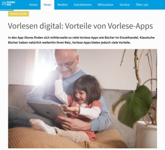 In den App-Stores finden sich mittlerweile ähnlich viele Vorlese-Apps wie Bücher im Einzelhandel. Klassische Bücher haben natürlich weiterhin ihren Reiz, Vorlese-Apps bieten jedoch viele Vorteile. Die Webseite gibt zudem einen Überblick über neue Methoden des Vorlesens mit Hilfe von Apps, verdeutlicht die Merkmale von Vorlese-Apps und gibt Beispiele geeigneter Apps zum Vorlesen.