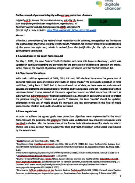 Der Gesetzgeber hat mit der Novellierung des Jugendschutzgesetzes den Rechtsbegriff der persönlichen Integrität neu in das Jugendschutzgesetz eingeführt. Der Text unterbreitet in englischer Sprache ein Verständnis des Schutzziels, welches anhand der Reformbegründung sowie weiterer Entwicklungen im Themenfeld hergeleitet wird. Demnach umfasst die persönliche Integrität den Schutz der physischen und psychischen Unversehrtheit sowie der persönlichen Daten. Insbesondere sind die altersgerechte und zukunftsoffene Entwicklung sowie die informationelle und sexuelle Selbstbestimmung der Minderjährigen sicherzustellen. Die Ausnutzung von Unerfahrenheit und Alter, eine wirtschaftliche Ausbeutung sowie die kommerzielle oder andere zweckfremde Verarbeitung und Verbreitung von Nutzendendaten stehen im Umkehrschluss dem Schutz der persönlichen Integrität entgegen.