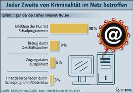 <p>Viren und andere Schadprogramme sind die häufigste Erfahrung mit Kriminalität im Internet. 38 Prozent der Internetnutzer ab 14 Jahren - das entspricht fast 20 Millionen Deutschen - haben erlebt, dass ihr Computer infiziert wurde. Das geht aus einer neuen Umfrage von Forsa für den BITKOM hervor. "Schadprogramme beeinträchtigen nicht nur die Funktion von PCs, sondern werden zunehmend zur Ausspähung digitaler Identitäten eingesetzt", kommentiert BKA-Präsident Ziercke. </p>