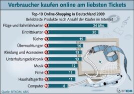 <p>Tickets für Flüge und Bahnfahrten sind die beliebtesten Produkte beim Online-Shopping. Mit 47 Prozent haben fast die Hälfte aller Internetnutzer in Deutschland bereits eine Bahnfahrkarte oder ein Flugticket im Netz gekauft.Auf Platz zwei folgen Eintrittskarten für Konzerte, Theater, Kino oder andere Events. 40 Prozent der Internetnutzer oder 20 Millionen Deutsche haben bereits Eintrittskarten im Internet geordert. Den dritten Rang der beliebtesten Online-Produkte belegen Bücher.</p>