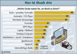 Die Zeiten, in denen die Musik primär aus der Stereoanlage oder dem Radioapparat kam, sind vorbei. Auf immer mehr Geräten wird Musik abgespielt und gehört. Bei jungen Deutschen unter 30 Jahren nutzen 80 Prozent dafür einen MP3-Player und knapp die Hälfte (46%) ihr Handy oder ihren Computer.