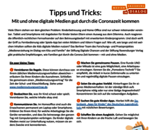 Infosheet für Kitas mit hilfreichen Tipps an die Eltern, wie sie gut mit und ohne digitale Medien durch die Coronazeit kommen