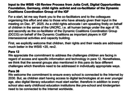 Die schriftliche Stellungnahme zu den Rechten von Kindern im digitalen Umfeld steht unten in englischer Sprache zum Download zur Verfügung. Der Beitrag wurde im Rahmen des WSIS+20-Überprüfungsprozess verfasst.